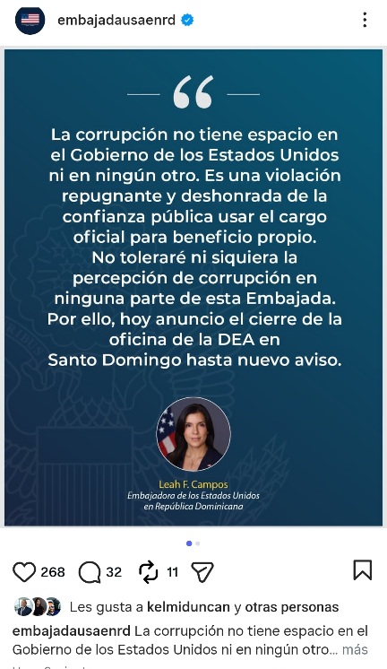 El comunicado dice textualmente: “La corrupción no tiene espacio en el Gobierno de los Estados Unidos ni en ningún otro. Es una violación repugnante y deshonrada de la confianza pública usar el cargo oficial para beneficio propio. No toleraré ni siquiera la percepción de corrupción en ninguna parte de esta Embajada. Por ello, hoy anuncio el cierre de la oficina de la DEA en Santo Domingo hasta nuevo aviso. Leah F. Campos, embajadora de los Estados Unidos en República Dominicana”.