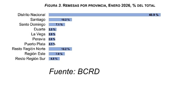 Respecto a la distribución de las remesas recibidas por provincias, el BCRD señala que el Distrito Nacional recibió una proporción del 48.9 % durante enero, seguido por las provincias de Santiago y Santo Domingo, con un 10.2 % y 7.1 %, respectivamente. Esto indica que unas dos terceras partes de las remesas (66.2 %) se reciben en las zonas metropolitanas del país.