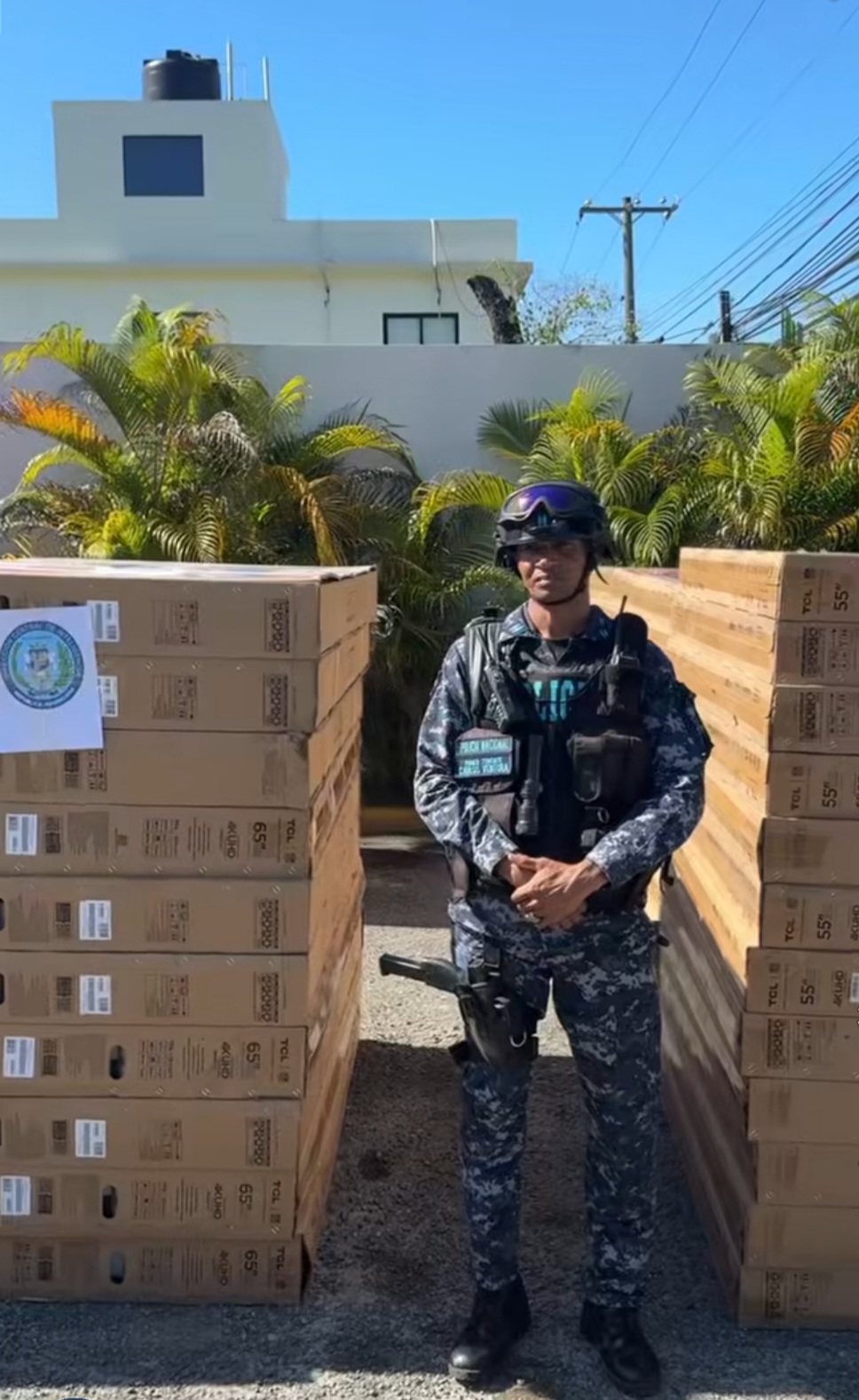 Los televisores están en la sede policial de Invivienda, en Santo Domingo Este. El vocero policial explicó que los televisores estaban siendo sacados del furgón para transportarlos a 4 camiones, los cuales están detenidos, asi como una yipeta y una arma de fuego.