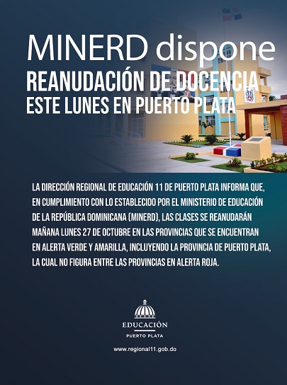 La Dirección Regional de Educación 11 de Puerto Plata informó que, en cumplimiento con lo establecido por el Ministerio de Educación de la República Dominicana (MINERD), las clases se reanudarán mañana lunes 27 de octubre incluyendo a Puerto Plata.