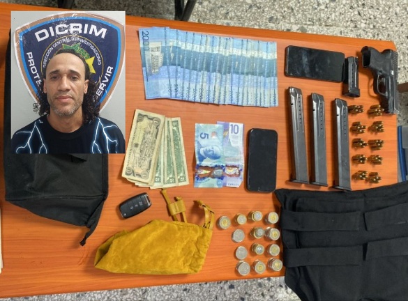 Agentes del Departamento de Investigaciones Criminales (Dicrim) de la Policía con asiento en el municipio Sosúa apresaron a un hombre, a quien ocuparon una pistola sin documentos, tres cargadores, un chaleco antibalas, dinero y otros objetos.
