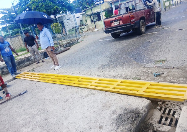 El alcalde municipal, Diomedes Roque García (Roquelito), realizó este lunes una jornada de trabajo enfocada en la solución de problemáticas comunitarias, con la colocación de una nueva parrilla en un badén ubicado en la calle Mella esquina San Felipe