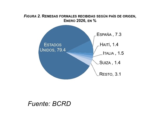 El BCRD destaca también la recepción de remesas por canales formales desde otros países en el mes de enero, como España con un 7.3 % del total, siendo este el segundo país en cuanto al total de residentes de la diáspora dominicana en el exterior. Por su parte, Italia contribuyó con el 1.5 % del total de flujos recibidos, mientras que Haití y Suiza aportaron 1.4 % cada uno. En el resto de la recepción de remesas se distinguen países como Canadá y Francia, entre otros.
