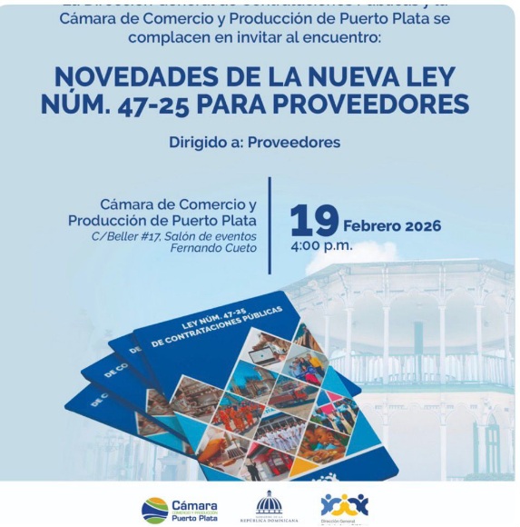 Puerto Plata. – La Cámara de Comercio y Producción de Puerto Plata y la Dirección General de Contrataciones Públicas te anunciaron la realización de la charla:“Sé proveedor del Estado: Beneficios de la nueva Ley 47-25”.