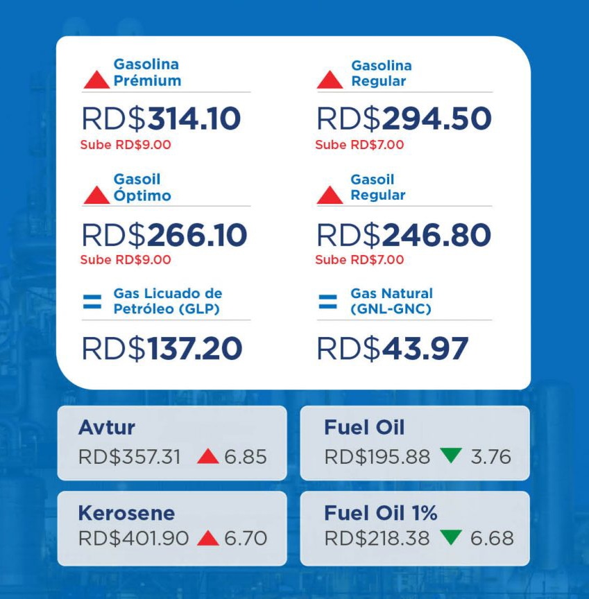 “En momentos dónde los precios del petróleo alcanzan variaciones sin precedentes en el mercado internacional, los precios del GLP y los del gas natural mantendrán su precio en territorio dominicano; mientras que la gasolinas premium y regular recibirán un reajuste de RD$9.00 y RD$7.00 respectivamente. De igual forma, el gasoil regular y óptimo serán reajustados con un aumento de RD$7.00 y RD$9.00 por galón, mientras que el avtur aumenta RD$6.85 y el kerosene RD$6.70. El Fuel Oil #6 baja RD$3.76 de precio y el Fuel Oil#1 baja RD$6.68”, precisan.